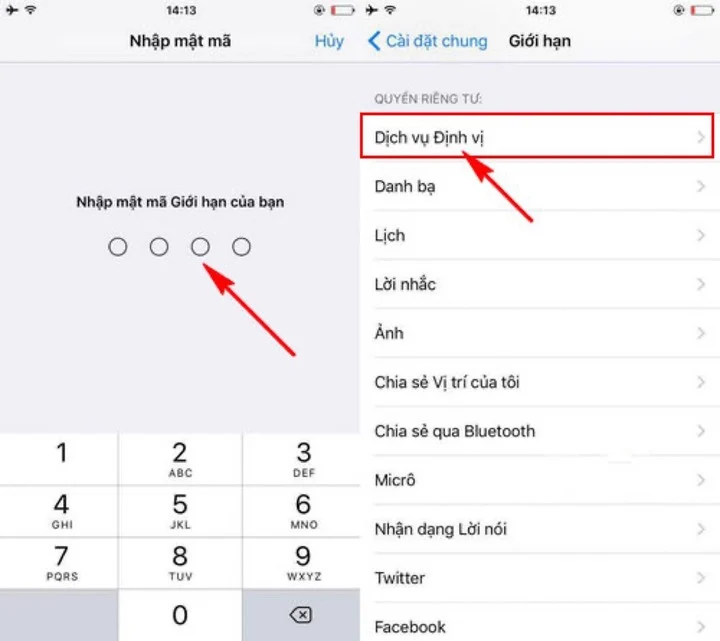 Bước 2: Hệ thống sẽ yêu cầu bạn thực hiện việc nhập mật khẩu Giới hạn để xác nhận, sau đó chúng ta tìm kiếm và ấn chọn chức năng Dịch vụ định vị như hình dưới.