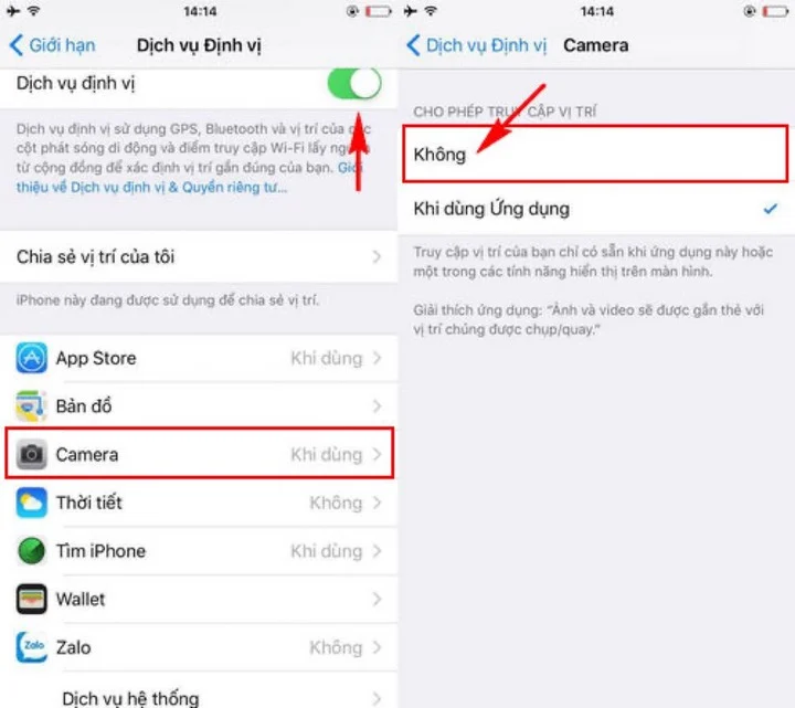 Bước 3 : Tại đây các bạn có thể ấn chọn Tắt dịch vụ định vị hoặc lựa chọn vào các ứng dụng đang sử dụng dịch vụ định vị trên thiết bị và ấn chọn Không, để tắt.