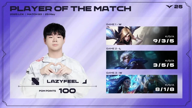 LazyFeel đã có màn ra mắt chính thức trong trận đấu giữa đội của anh và một trong những ông lớn của LCK. Dù phải đối đầu với áp lực khổng lồ, anh vẫn thể hiện phong độ ổn định, thậm chí có những pha xử lý kỹ thuật khiến khán giả lẫn bình luận viên không khỏi trầm trồ.