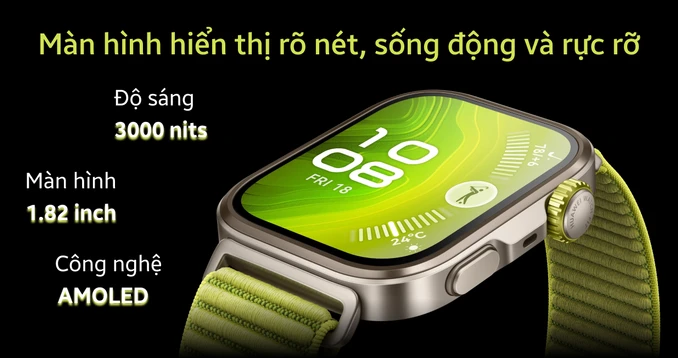 Khung viền của Watch Fit 4 Pro được làm từ hợp kim titan, cho cảm giác nhẹ tay nhưng vẫn rất chắc chắn. Dây đeo silicone cao cấp có thể thay thế dễ dàng, phù hợp cả khi luyện tập thể thao lẫn khi phối đồ thời trang. Màn hình AMOLED 1.82 inch có viền mỏng, độ sáng cao và màu sắc sống động, hỗ trợ luôn chế độ màn hình luôn bật (Always-On Display).
